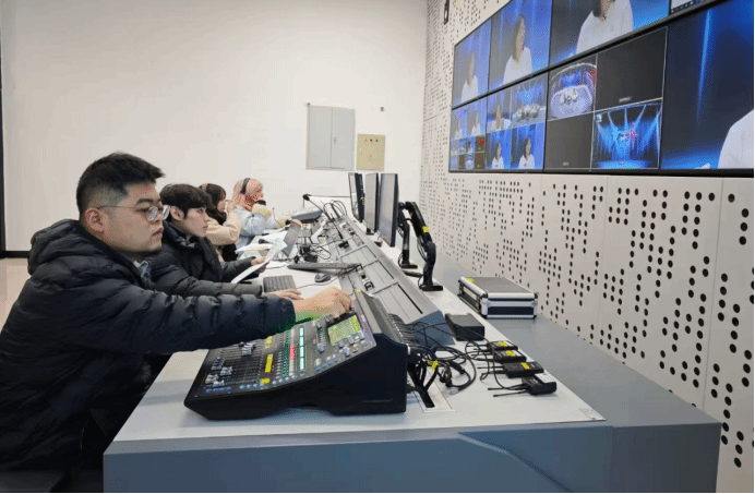 我校演播厅对标广播级标准建设,配备高清录制系统、专业灯光音响设备与多机位导播控制台,可全方位满足大型综艺、访谈类节目的录制需求,是学校打造产教融合实训基地的核心载体。节目录制期间,摄像、导播等核心技术岗位均由我校相关专业师生团队独立承担。从1月9日下午的精细彩排、技术参数核对,到1月10日全天的正式录制,师生团队全程深度参与,将课堂理论知识转化为现场实操技能,展现出卓越的专业素养与高效的团队协作能力。